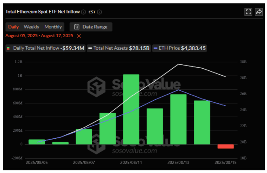 The optimism around Ethereum’s rally cooled just as the week came to a close. Notably, US-based Spot ETH ETFs reported net outflows of $59.34 million on August 15, effectively ending an eight-day streak that had added $3.7 billion in inflows.