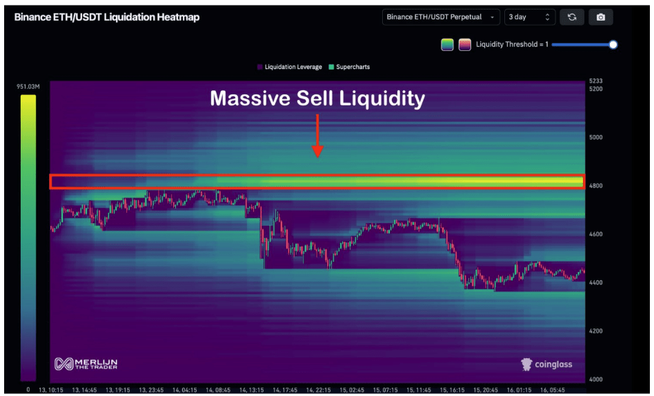 Speaking of Ethereum failing to clear $4,788, on-chain data shows a huge cluster of liquidity around this level. Particularly, Merlijn The Trader described the $4,800 as the “final boss” for ETH, pointing to billions in sell orders stacked at that level on Binance’s ETH/USDT pair.