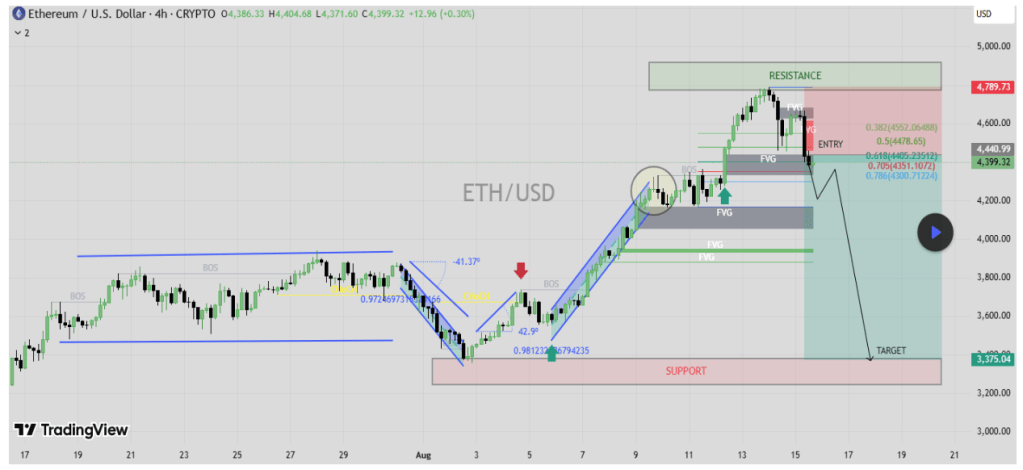 However, multiple technical alignments, such as Break of Structure signals, fair value gaps (FVG), and Fibonacci retracements, show that Ethereum may be due for a retracement. The trade plan outlined anticipates an entry around $4,440, with a stop loss above $4,790 and a downside target of $3,375 at a strong support area. This would imply a corrective move of over 20% if the bearish projection plays out.